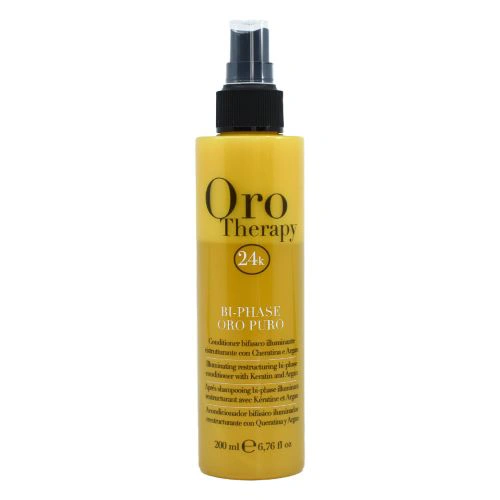 A ragyogó kétfázisú hajbalzsam spray Fanola Oro Puro Therapy 24K Bi-Phase Conditioner, mélyen táplálja és ragyogóvá teszi a hajat, élettel teli és bársonyosan puha eredményt igérve.