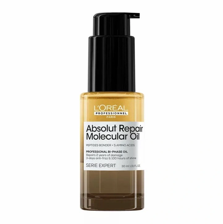 Az Absolut Repair Molecular kétfázisú olaj minden szerkezetében sérült hajra, amely akár 3 napon át tartó szöszösödésgátló hatást és akár 100 órán át tartó ragyogást biztosít a hajnak.
