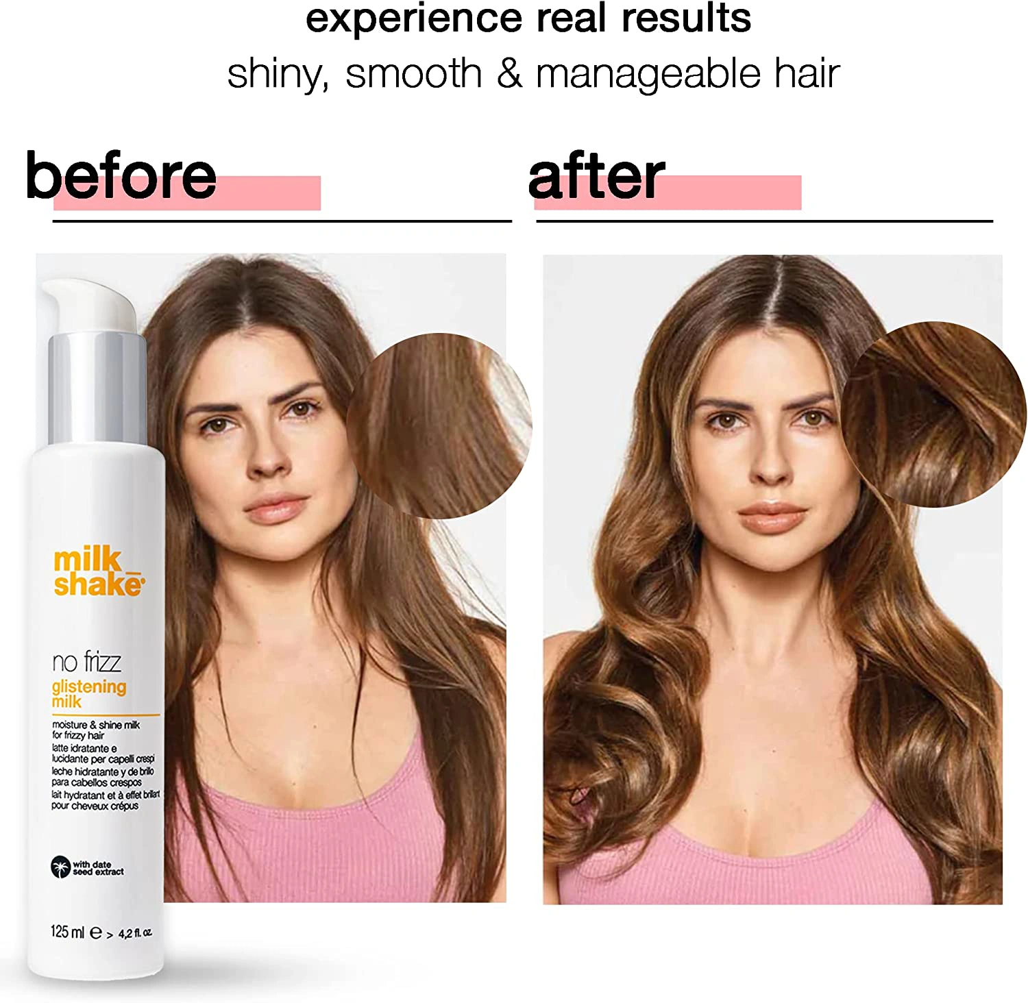 A Milk_Shake Glisteninget arra tervezték, hogy fényesítse, kezelje és védje a hajat a hőtől forró hajformázó eszközök használata közben. Az eszköz kivételes puhaságot kölcsönöz a haj szerkezetének, megkönnyíti a fésülési folyamatot, fényűző fényt biztosít. Ezenkívül ez a termék megvédi a hajszínt a fakulástól. És természetesen megvédi a hajat a göndörödéstől!