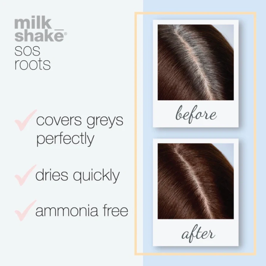 A milk_shake® sos roots egy azonnali hajfrissítő lenövéselfedő spray a hajtövekhez. A 6 árnyalatból álló választék minden hajszínhez igazodik, és minden hajtípuson hatékony: sötétbarna / barna / világosszőke / szőke / mahagóni / fekete. A milk_shake sos roots azonnali és teljes fedést biztosít az ősz haj számára is.