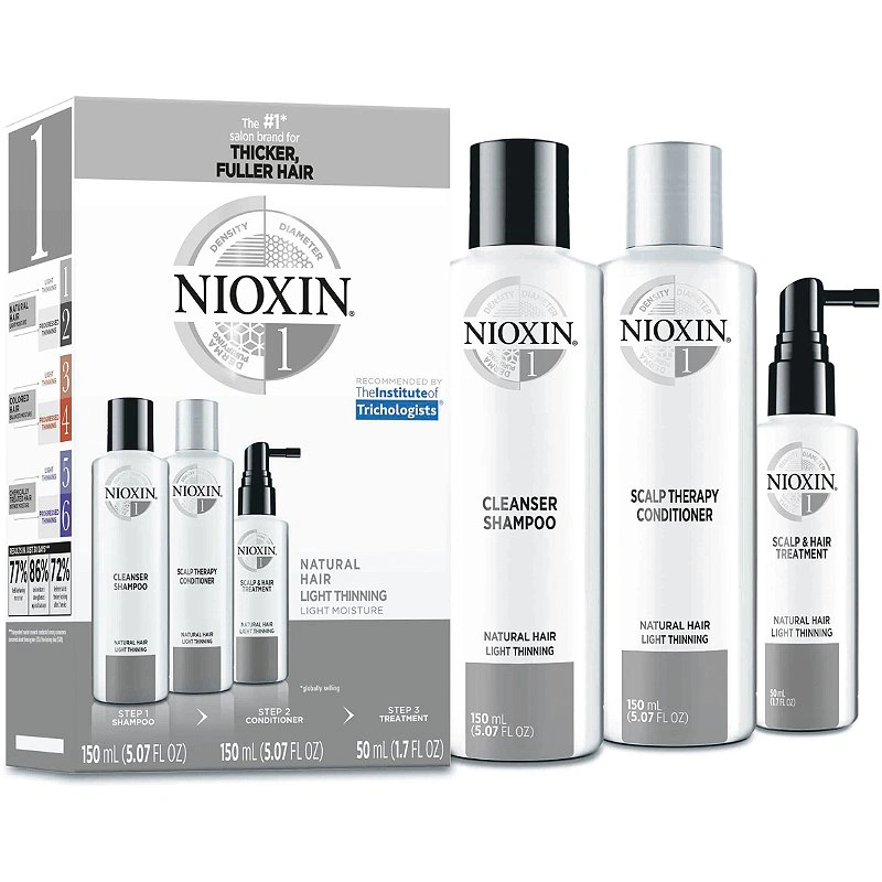 A Nioxin Hair Care System 1 készlet enyhén ritkított természetes hajhoz lett kifejlesztve. Felerősíti a haj szerkezetét és védi a hajat töredezésétől. Ez az egyedülálló, három professzionális hajtermékből álló készlet, amely fejlett bőrápolási tanulmányok vizsgálatának eredményén alapul, kifejezetten hajsűrítő kezelésként lett kialakítva, teltebb megjelenésű hajat biztosítva. A Nioxin System 1 kezelés csökkenti a töredezett hajhullást, erősíti a hajat és egészséges fényt kölcsönöz a természetes hajnak, miközben felfrissíti a fejbőrt. A Nioxin Cleanser sampon eltávolítja a szennyeződéseket, faggyút és egyéb környezeti maradványokat a fejbőrről és a hajról. A Nioxin Scalp Therapy Conditioner egy könnyű kondicionáló, amely rugalmasságot biztosít a hajnak, hidratálja a fejbőrt és a hajat a tövektőltől a hajvégekig. A Nioxin Scalp & Hair Treatment felfrissíti a fejbőrt és növeli a haj minden szálának térfogatát.