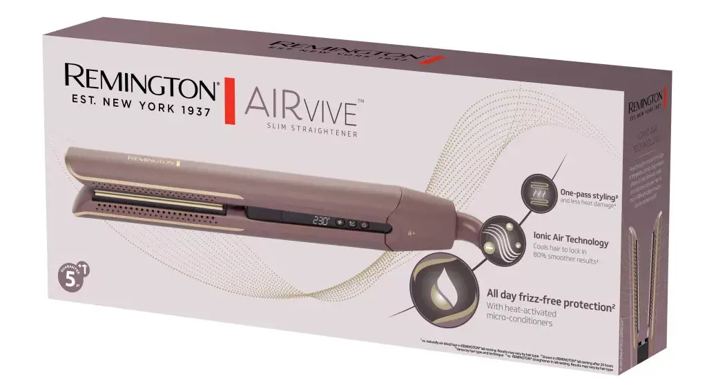 A Remington® AIRvive™ hajsimítóval 80%-kal simább1 eredmény érhető el. A hajformázás során a gyengéd Ionic Air technológia segít megszüntetni a statikus feltöltődést, és azonnal lehűti a hajat, hogy a frizura rögzüljön, és ragyogó legyen a végeredmény. Az ultrasima kerámiabevonatú hajformázó lapok nemcsak könnyedén siklanak a hajadon, hanem új összetételű, hőre aktiválódó mikro kondicionálókkal vannak átitatva, amelyek átkerülnek a hajadra, hogy egész nap távol tartsák a szénaboglyahatást2.