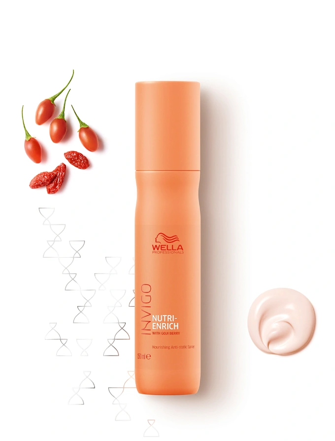 A Wella Professionals Invigo Nutri-Enrich tápláló antisztatikus spray egy egyedülálló ápoló és formázó szer, amely a túl vékony, legyengült és kémiailag roncsolt szálak gondozására készült. A spray egyenletesen beborítja a hajat, nem terheli túl, antioxidánsok, regeneráló és hidratáló anyagok koktéljával telít, azonnal hipnotizáló fényt és kasmír puhaságot ad. A spray ultratápláló növényi kivonatokat (goji gyümölcsök, fehér fűzfa, olíva), növényi fehérjéket (búza, rizs) és jojobaolajat tartalmaz, amely garantálja a fürtök intenzív nedvességtelítettségét, fiatalítását és erősítését a teljes hosszában. A terméknek köszönhetően a haj simaságot és rugalmasságot kap, selymessé, erőssé és fényessé válik.Egy speciális kondicionáló és antisztatikus komplex megakadályozza a télen különösen fontos statikus hatásokat, és eltávolítja a fodros végeket, egyszerűbbé teszi a fésülést és a frizurát, valamint véd a magas hőmérséklet hatására bekövetkező nedvességvesztéstől.
