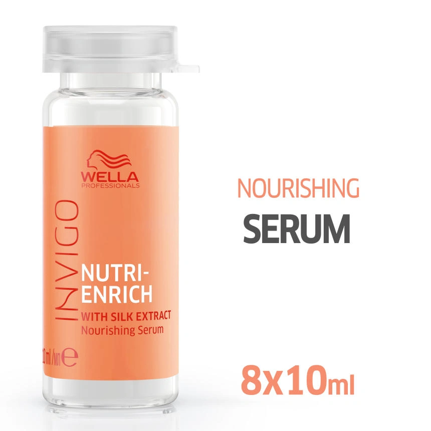Tápláló szérum. Azonnali táplálás a száraz és igénybevett haj számára, hogy puhává és élettel telivé váljon.WELLA PROFESSIONALS Invigo Nutri-Enrich tápláló szérum 8 × 10 ml: WELLA PROFESSIONALS Az Invigo Nutri-Enrich hajszérum egy felső hajápoló termék a száraz és roncsolt haj ápolására. Hidratálja, regenerálja és azonnal táplálja a hajat. Helyreállítja elveszett fényüket, és a selyemkivonatnak köszönhetően sima és rugalmas marad. Egyedülálló öblítésmentes formula nem terheli a hajat, közvetlenül behatol a hajrostokba és nagyon könnyen alkalmazható. A WELLA PROFESSIONALS Invigo Nutri-Enrich hajszérum összetétele olajsavat, E-vitamint, pantenolt és különösen kínai egreset, vagy goji bogyót tartalmaz, amely rendkívül gazdag vitaminokban, ásványi anyagokban és peptidekben.